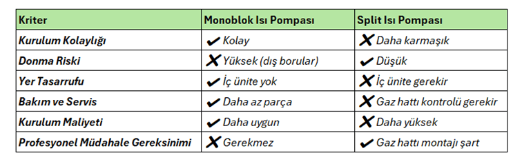Küçük evler, yazlıklar, yer sorunu olan ve iç ünite kurulamayacak yerlerde monoblok modeller tercih edilmektedir. Ayrıca maliyeti düşürmek için de bu ürünleri tercih edebilirsiniz. Daha soğuk iklimlerde cihazdan daha fazla verim alabilmek için split modelleri seçilebilmektedir. Ek olarak koşullar göz önüne alındığında her iki sistem de son derece verimlidir. Ancak size en uygunu yine siz seçebilirsiniz. Dilerseniz bize ulaşabilirsiniz. Aşağıdaki karşılaştırma tablosunu inceleyebilir, ısı pompası kurulum maliyeti yazımızı inceleyebilirsiniz.